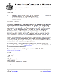 Application has been made by the Saratoga Solar Project, LLC to the Public Service Commission of Wisconsin. The letter can be viewed below. To access the information contained in the application, click here.